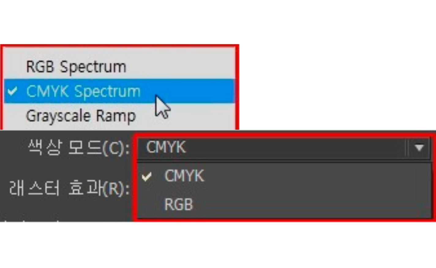 작업 시 색상 설정을 CMYK로 변경해 주세요