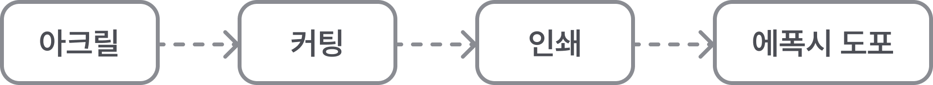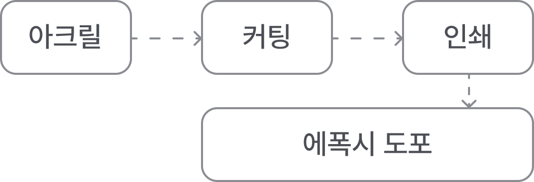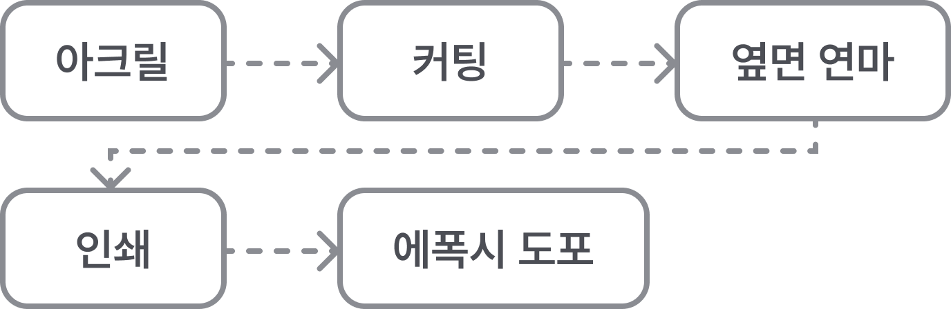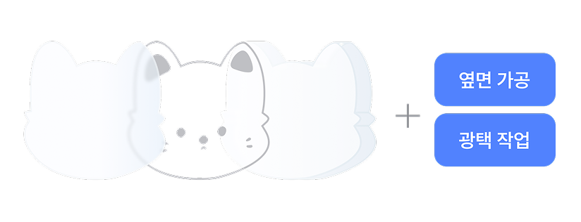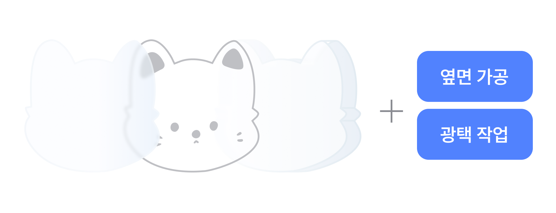 에폭시 코팅에 옆면 가공을 추가 하는 방식으로, 기존 에폭시 방식에 더해 옆면까지 정교하게 가공하여 투명하고 세련된 마감 처리가 가능합니다. 가장 견고하고 완성도가 높은 방식으로 프리미엄 굿즈에 활용됩니다.